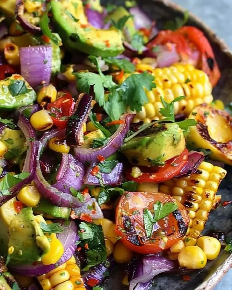 The charred corn avocado salad shines brightly as a side dish with grilled meats or fish. Imagine juicy grilled chicken or succulent salmon set against the vibrant flavors of charred corn, creamy avocado, and sweet roasted red onions. It’s a match made in culinary heaven! Not only does the freshness of the salad balance the richness of the protein, but it also adds a burst of color to your plate. For the best impact, serve your salad chilled alongside hot-off-the-grill proteins, and consider garnishing with fresh herbs like cilantro or parsley for an extra pop.