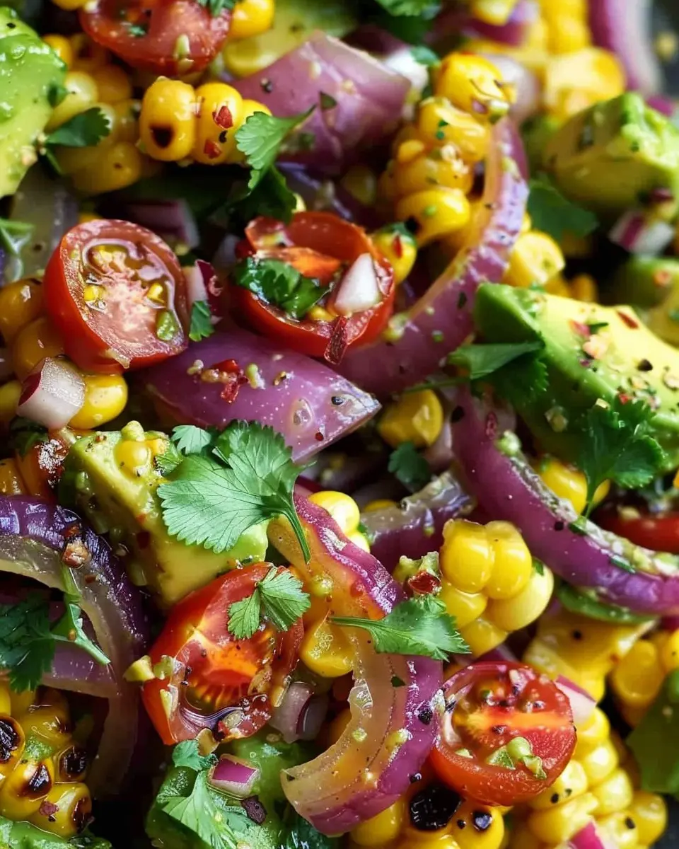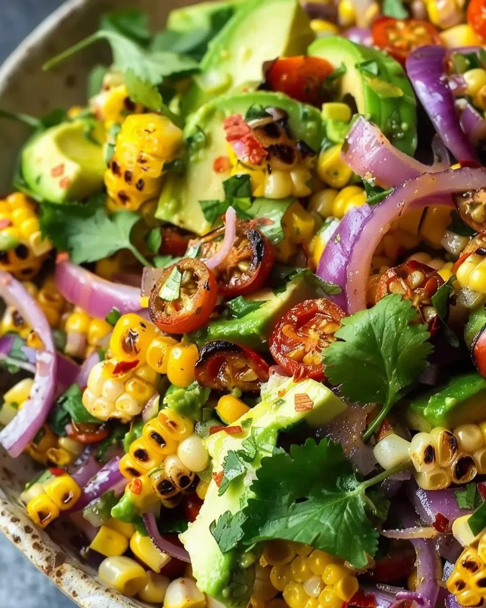 A refreshing salad that perfectly balances the sweetness of charred corn, the creaminess of avocado, and the savory flavor of roasted red onions.
