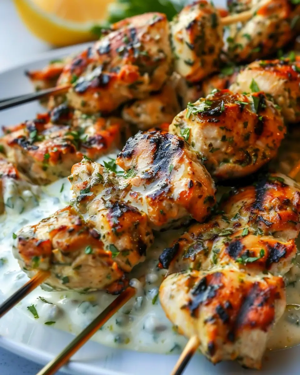 This creamy, tangy sauce perfectly balances the flavors of the succulent chicken skewers.